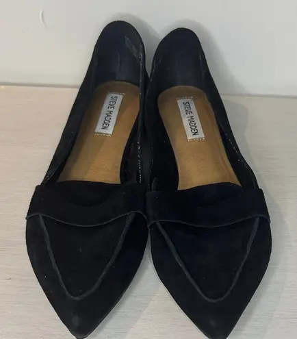 Chic black suede loafers by Steve Madden. Sleek design with pointed toe. Ideal for versatile styling... Show more