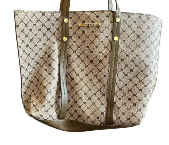 The Steve Madden tote is designed for women and features a geometric pattern in a brown hue. It is c... Show more