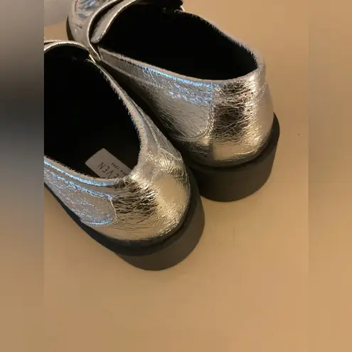 Stylish silver metallic loafers with tassel detail. Perfect for a chic look. Great Condition Steven New York by Steve Madden Women Silver Platform Beryn Loafer Shoes Great condition as they been gently worn with little wear and no flaws. They are lightweight with leather cushion insoles designed for all day comfort. Retail price new was160.00 LF 2 inch block heels 3 inch shaft Comes from smoke free home and ships within 24 hours