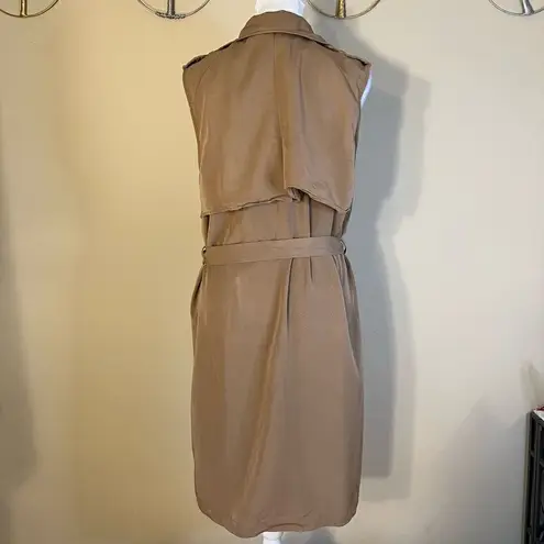 From Stradivarius, this open front trench features shoulder epaulettes, side vents, and an attached sash. Sleeveless. Soft and very lightweight! Has pockets, but the opening is still sewn shut. Can be cut to be opened by the buyer. 80% Viscose 20% Polyester Machine wash on gentle cycle. Womens size small Please see photos for approximate measurements. TU1 / GB