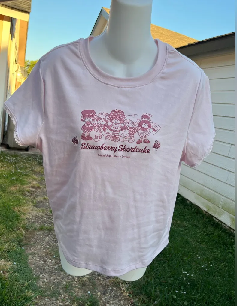 Cute pink t-shirt featuring Strawberry Shortcake design. Perfect for casual wear. Like new without tags. Tried on but did not like the fit. Size XL. Super cute top with strawberry shortcake and friends. Was not cropped on me. (I am 5’1)