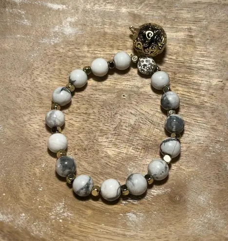 Stretchy Marble Beaded Diffuser Charm Bracelet. The bracelet has a little lava bead in the gold locket. I have included extra lava beads. You drop your favorite essential oil on the lava bead. Good condition. Let me know if you have any questions! 😊