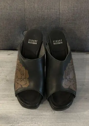 Stuart Weitzman open toe clogs/heels. Brown and black leather. Rose design on the heels with silver... Show more