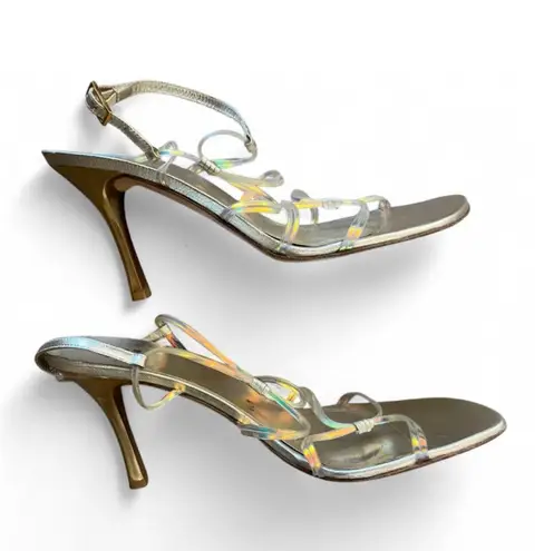 Stuart Weitzman | Iridescent ItGirl Stiletto 90s Sandal Heel Size 8 3.5" Heel ItGirl Gold Supple A4... Show more