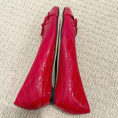 Ballet flats with quilted sides and cap toe and bow at toe. Slight wedge block heel Condition: like... Show more