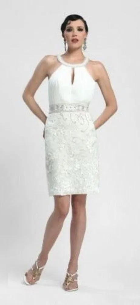 Sue Wong short white beaded dress size 8. Perfect for bride who doesn’t want to be too formal. Also great for a bridal shower or a black-and-white ball.  no stains, but there is some loose or missing beading around the neck line as picture. Not very noticeable. 16” bust 38” length