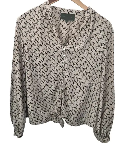 Anthropologie SUNDAY IN BROOKLYN Long Sleeve Blouse Fox Print Motif Women's Size Large. Beige with Red, Black and White print. V-Neck Long Sleeve. Buttons down front then ties at hem.