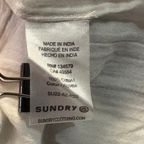 Chic & breezy Sundry tunic dress featuring a vertical stripe pattern in white & blue Lightweight dress has a 1/4 button-up front, 3/4 sleeves with cute detailing, & relaxed, comfortable fit Perfect piece for warm weather, this dress offers a versatile & stylish look Great for a casual brunch, a day at the beach, or a relaxed weekend getaway Sundry size 3 is equal to a large Measurements: • Pit to pit: 25" • Length: 35" • Sleeve: 16" • Waist: 23" • Hips: 24" Style: Shirt Dress, Sundress, T-Shirt Dress Dress Length: Knee Length Department: Women Sleeve Length: 3/4 Sleeve Pattern: Striped Occasion: Casual, Travel Material: 100% Cotton Neckline: V-Neck Theme: Bohemian Fabric Type: Woven Season: Summer, Spring Sleeve Type: Raglan Sleeve Sundry dress, striped tunic, casual, summer, boho, 3/4 sleeve, beach, cotton, relaxed fit, striped