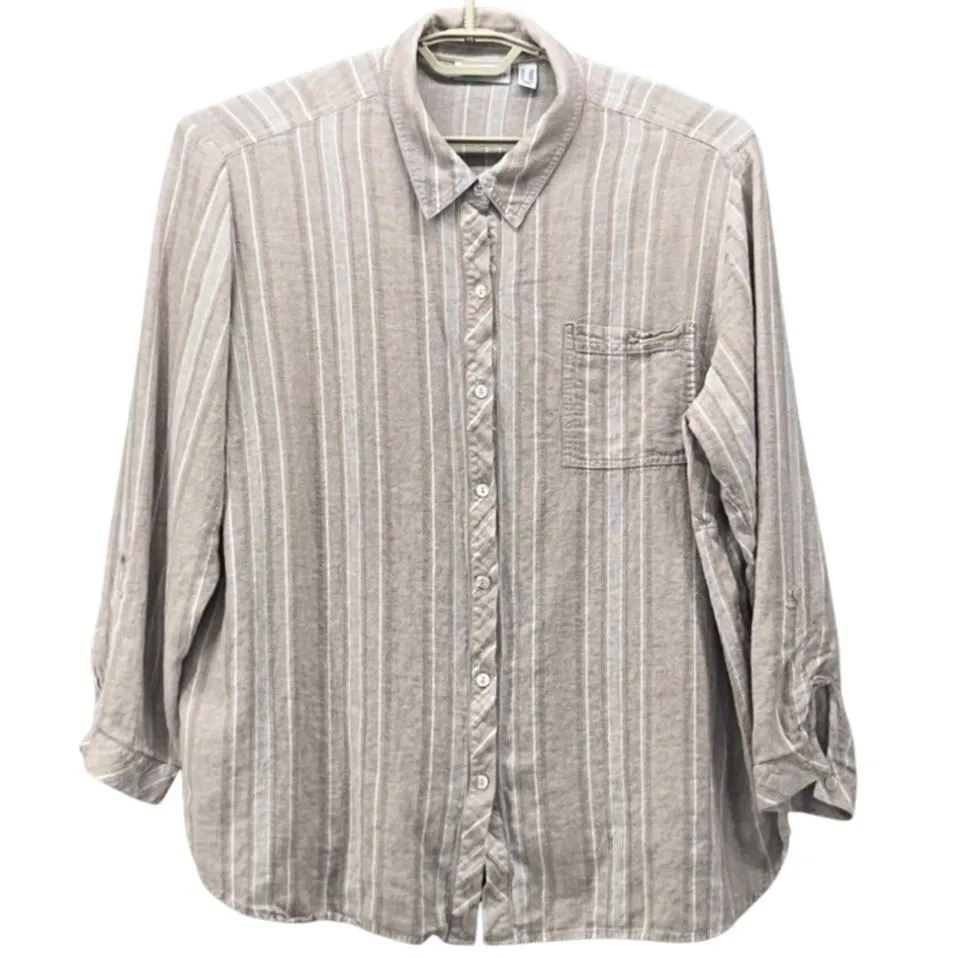 Effortless style awaits with this breezy button-down shirt. A relaxed silhouette drapes beautifully, enhanced by a classic collar and a full button placket. The subtle striped pattern adds a touch of visual interest, while the chest pocket offers a practical detail. The sleeves feature buttoned tabs, allowing you to adjust the length for a customized look. Thank you for checking my item. If you have any questions before and after purchase, please contact me first. Items came from smoke free, dog friendly home Please check measurement before buying. Measurements are also on photo. My handling time is 1 business day. Bundle and save Have a great day!!!!!
