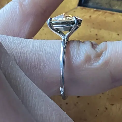 This pretty solitaire ring features a real champagne colored Swarovski crystal. The crystal measures about 12mm and is a carat weight of 4.75. The ring is set in solid .925 sterling silver, making it perfect for regular wear. The ring comes with a Swarovski tag as shown. Size 8. Inventory: J12