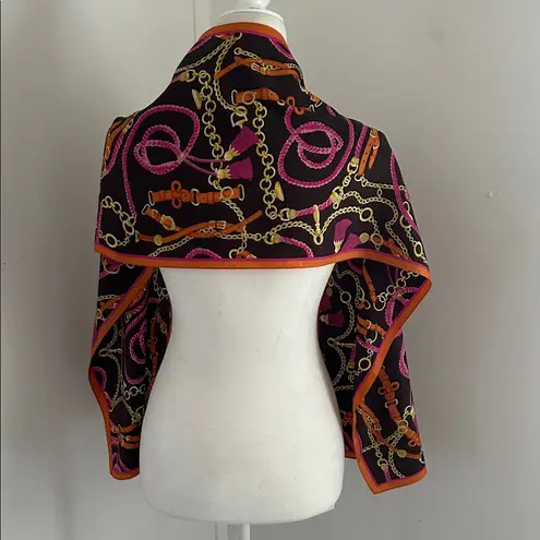 Vibrant scarf with chain and rope print. Features pink, orange, brown and gold accents. Tag is missing, but this was my personal scarf and I removed the tag. Nice rectangular scarf you can wear around your head, neck or waist. A few subtle marks that won’t be noticed when tied.