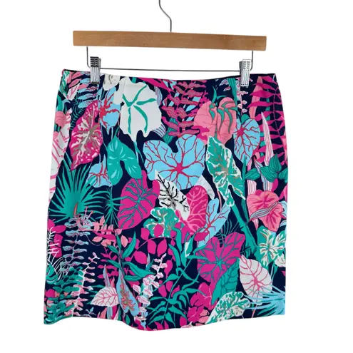 Excellent preowned condition. Colorful jungle botanical print straight lined above knee skirt. Zips... Show more