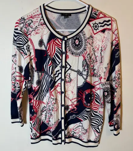Keywords: Talbots, Cardigan, Sweater, Nautical, Map Print, Petite, Womens, Medium Petite, MP, Red, Navy, Cream, Coastal, Maritime