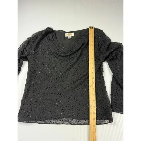 Elegant black mesh top with allover sparkle detail and cowl neckline. Features long sleeves and a sl... Show more