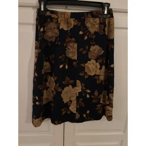 Evokes an understated elegance with this Talbots Petites silk skirt, blooming with a captivating rose print. The dark, romantic backdrop allows the golden roses to truly pop, creating a sophisticated and timeless visual appeal. Luxurious silk drapes beautifully, promising both comfort and a touch of refined grace. A smooth silhouette and tasteful design makes it a versatile piece, easily dressed up or down. Picture this skirt gracing a sophisticated evening gathering, adding flair to a museum visit, or simply elevating an everyday office look with its understated yet impactful charm. Length 22" waist 26".