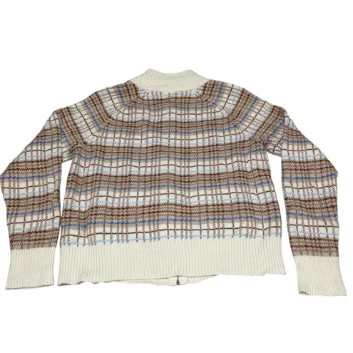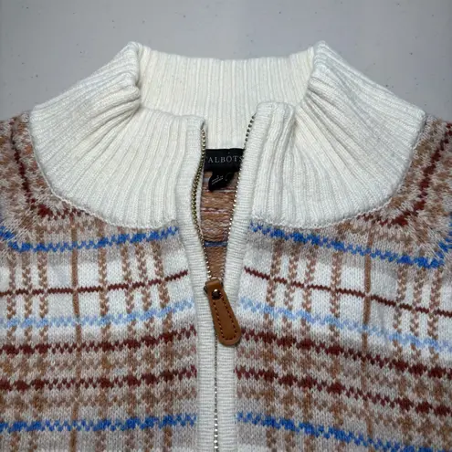 Talbots Plaid Zip Cardigan | Cotton Wool Blend | Cream Brown Blue | Size Large | Preppy Cozy