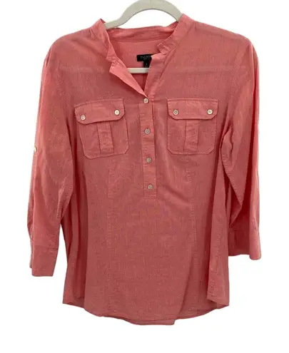 Talbots Popover Top Womens Small Peach Pink 100% Cotton Roll Tab Sleeves Mandarin Collar Approximat... Show more