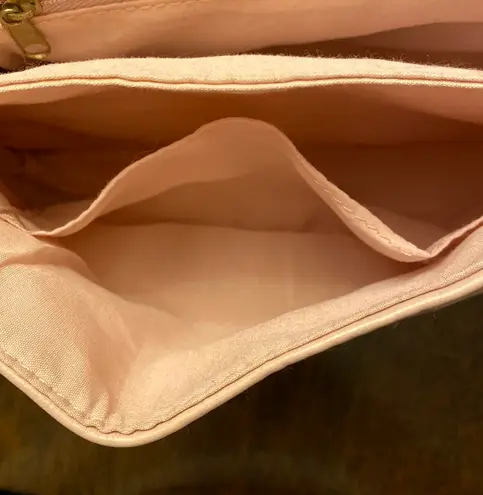 adjustable strap, couple scratches inside the purse, leather outside, light pink with gold chain, no... Show more