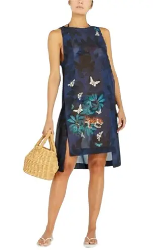 Beautiful print coverup dress, with images of flowers and bejeweled butterflies, on a sheer navy bac... Show more