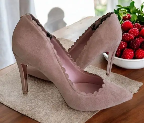Enhance your style with these elegant light pink blush suede heels by TED BAKER. Featuring a chic sc... Show more