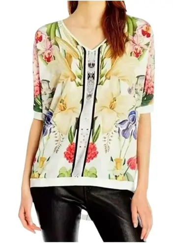 This Ted Baker women's small, ivory shirt features a silky floral print design on the front and a knit back with half sleeves. The colorful floral pattern lends a classy touch to your wardrobe.