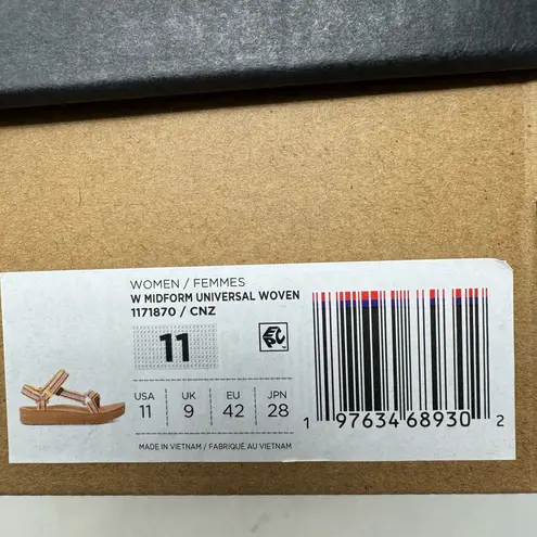 These Teva Midform Universal Woven Sandals are a summer essential with a lightweight platform, colorful woven straps, and all-day comfort. Details: • Size 11 • Coconut / Tanzine multi-color • 1” platform, 1.25” heel • Adjustable straps for secure fit • EVA footbed and midsole • Rubber outsole for grip Condition: Brand new in box with tags. Perfect for vacations, walking, athleisure looks, festivals, and everyday summer wear. teva sandals, midform universal, platform sandals, size 11 sandals, women athleisure shoes, beach sandals, travel sandals, summer sandals, colorful woven sandals, walking sandals, festival shoes, comfort sandals, sporty sandals, outdoor footwear
