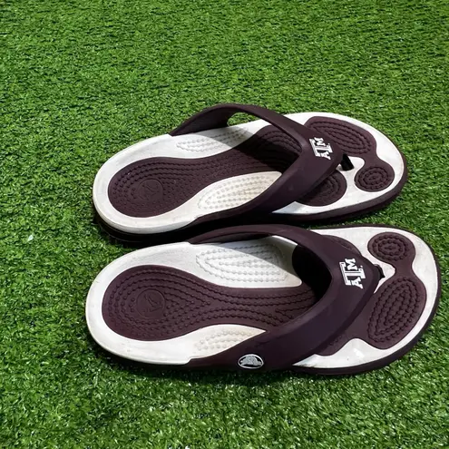 The product is a pair of Texas A&M Flip Flood Crocs sandals in women's size 6. These maroon sandals... Show more