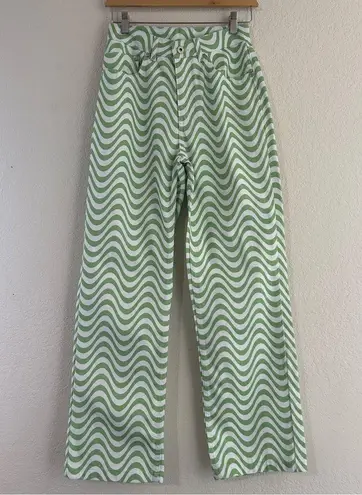 Neon green and white wave print Ragged Priest Prism jeans, in excellent condition. Relaxed straight leg. Mid Rise waist. Zip and button closure. Five pocket design. 100% Cotton