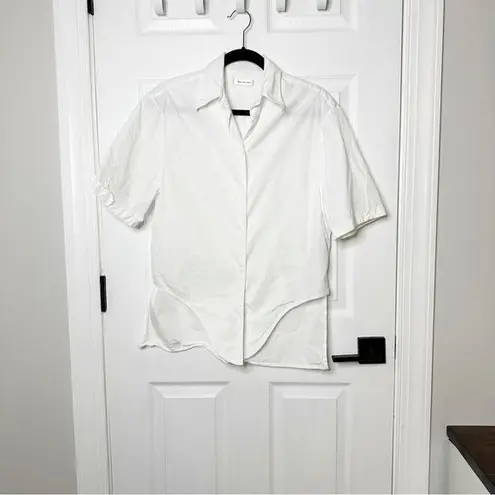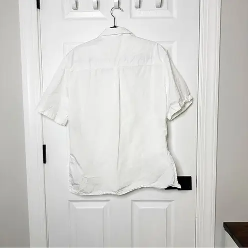 Minimalist and chic white short sleeve cotton button down with knot front detail. Relaxed or oversiz... Show more