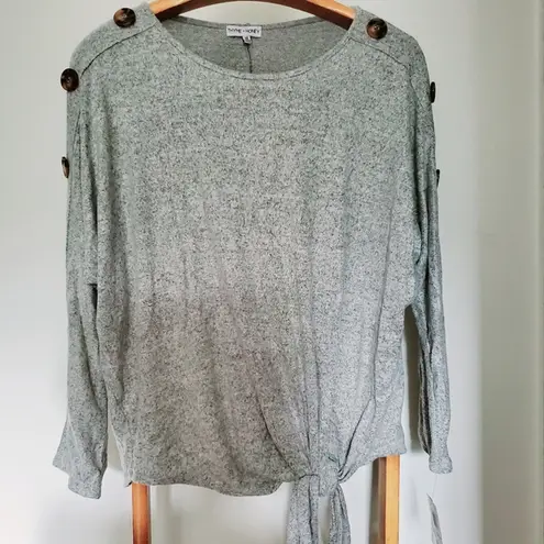 Thyme + Honey Grey Button Accent Side Knot Top 1X Front knot Brown Button accents along shoulder and upper arm Long sleeve light weight Light fuzzy soft outside Silver Grey and ivory Roughly 29 inches pit to pit