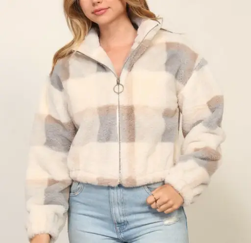 Soft and warm teddy jacket with a plaid pattern. Features cream and brown tones. Perfect for layerin... Show more