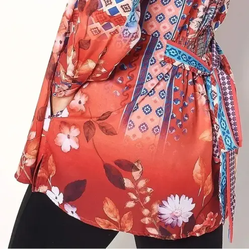 Excellent preowned condition, no found flaws Fabrication: woven moss crepe Features: printed, mandarin collar, half placket with button-front closure, long sleeves, wide button cuffs, self-tie waist belt Fit: semi-fitted; follows the lines of the body with added wearing ease Content: 100% polyester Smoke-free home