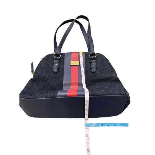 Classic Tommy Hilfiger denim satchel with signature stripe. • Dark wash denim body with bold re... Show more