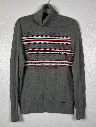 Chic gray turtleneck with stylish stripes. Features red, white, and black accents. Perfect for cozy... Show more