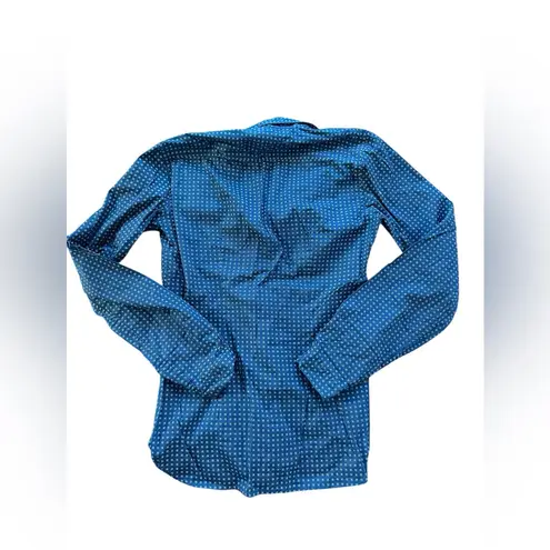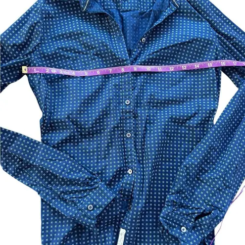 Navy button-up shirt with subtle white patterns. Ideal for versatile styling.