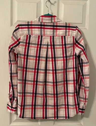 Embrace timeless style with the Vintage Tommy Hilfiger Half Button Up Red/Navy/White Plaid Shirt. Th... Show more