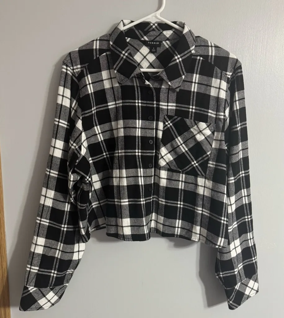 Slight cropped 22” pit to pit 25” sleeve Chic checkered design. Button-up front. Perfect for laye... Show more