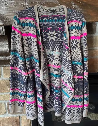 Fabulous Torrid sweater. Fairy isle colorful pattern. Open, draped style. Very flattering. Like new... Show more