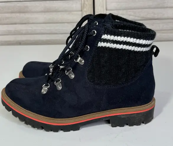 Gently used. Faux suede, lace up hiking boot in navy blue with flexible sweater knit fabric ankles.... Show more