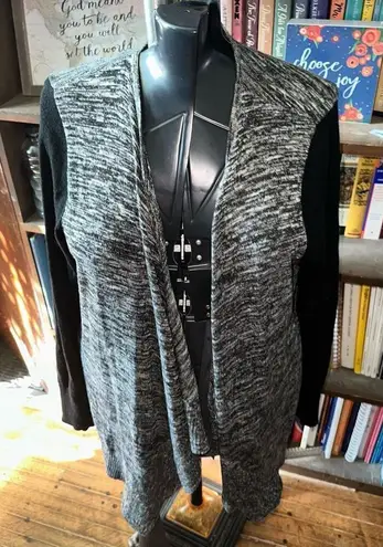 Torrid heathered gray, black sleeve, drape, asymmetrical, cozy cardigan. Pairs well with a basic tee... Show more