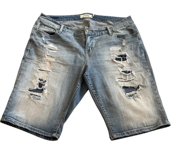 Trendy distressed jean shorts. Light blue wash. Casual and comfortable.