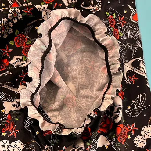Black skull and rose tattoo pattern. Ruffled sleeves with elastic band. Built in bra cups. Built... Show more