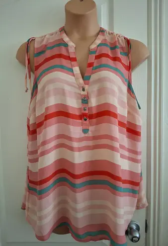 Chic sleeveless blouse with multicolor stripes. Features buttoned neckline. Ideal for casual outings... Show more