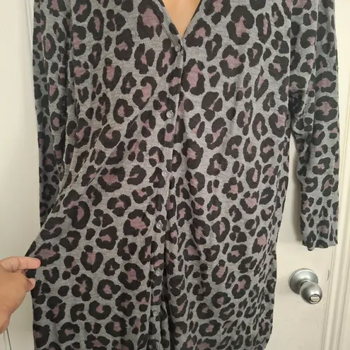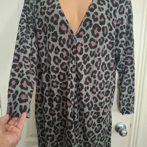 Trendy leopard print cardigan with a stylish V-neck. Features a blend of black, gray, and pink tones... Show more