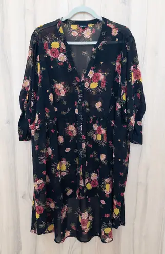 Features: Sheer black chiffon with allover floral print Button-front bodice with gathered waist 3/4... Show more