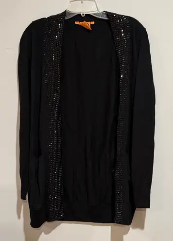 Chic black cardigan featuring elegant sequin trim. Ideal for a stylish look.