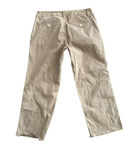 Size 30 Cropped inseam Raw fringe hem Zip fly Logo buttons Cotton Khaki tan color with gold button... Show more