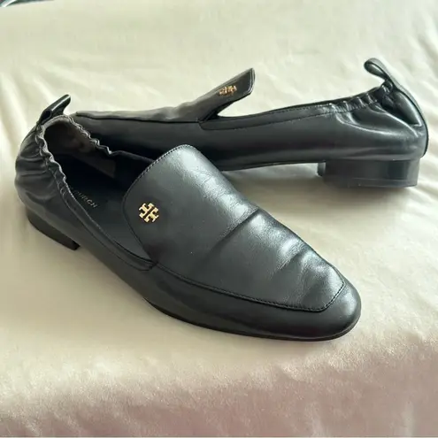 Chic black leather loafers with iconic logo accent. Comfortable and stylish. excellent preowned co... Show more