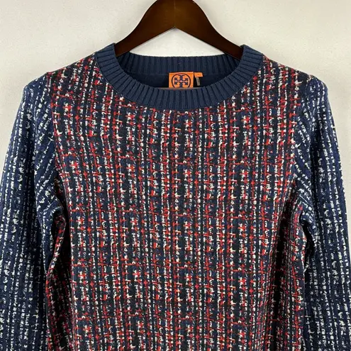 Stylish crewneck with intricate texture. Features a blend of navy, red, and white. Perfect for versa... Show more