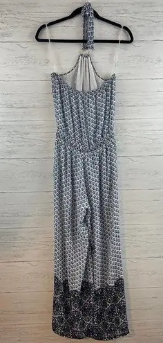Tory Burch blue and white printed halter wide leg jumpsuit - all over blue and white printed - silk... Show more